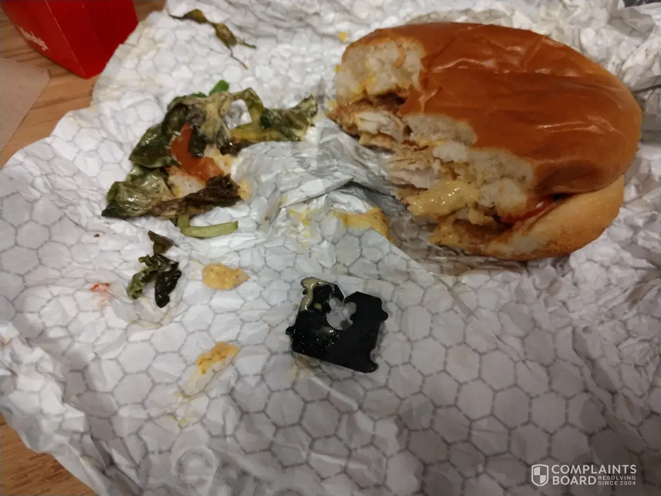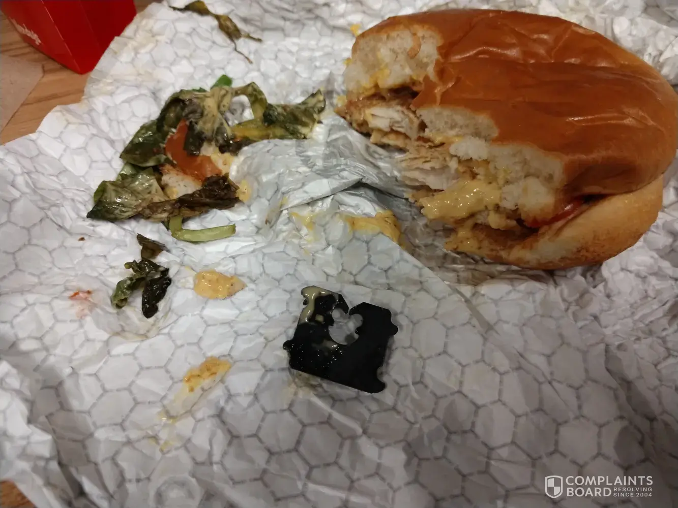 And what did they say when you went back up to the counter and showed them the chicken? There are unlikely to be any repercussions from only one bite of the chicken. The time to bring it up was while you were IN the restaurant. You obviously ate in, as evidenced in your picture. So why didn't you take it up then and ask for a refund?