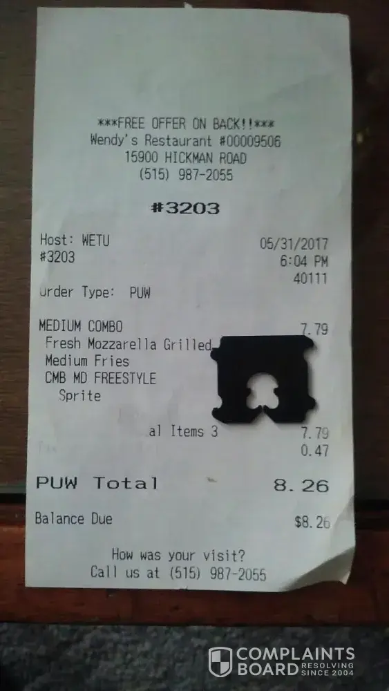 I went.to wendys in riverside corning! Myself and my 4 year old daughter went through the drivethru and ordered one of the 4 for speacials with upgraded bacenator. 🟠and a small frosty! I was eating my fries and came upon someones short gray hair so i went back through the take out window to show them and explain i had just lost my appetite! The manager asked for.my reciept(wich she never returned to me) and then brough me 3 back! Wow she gave me.the fries free ? What about mam im sorry can I get u anything else?