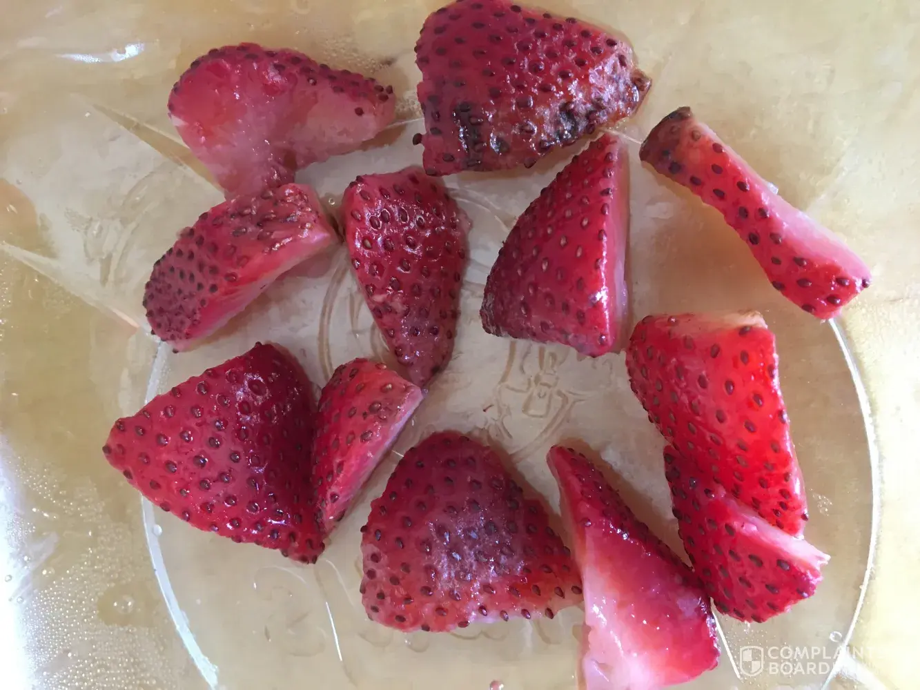 I ordered a strawberry mango salad from the Wendy's in New Lenox at the drive thru window. When I got home to eat it, I noticed the strawberries had bad spots & were not edible. It was not just one strawberry it was all of the cut up pieces of strawberries. See photo enclosed. Also, I ordered a small chocolate frosty & the spoon was malformed. It had sharp edges and clearly could not be used. I'm not sure why it was handed to me out the drive thru window.