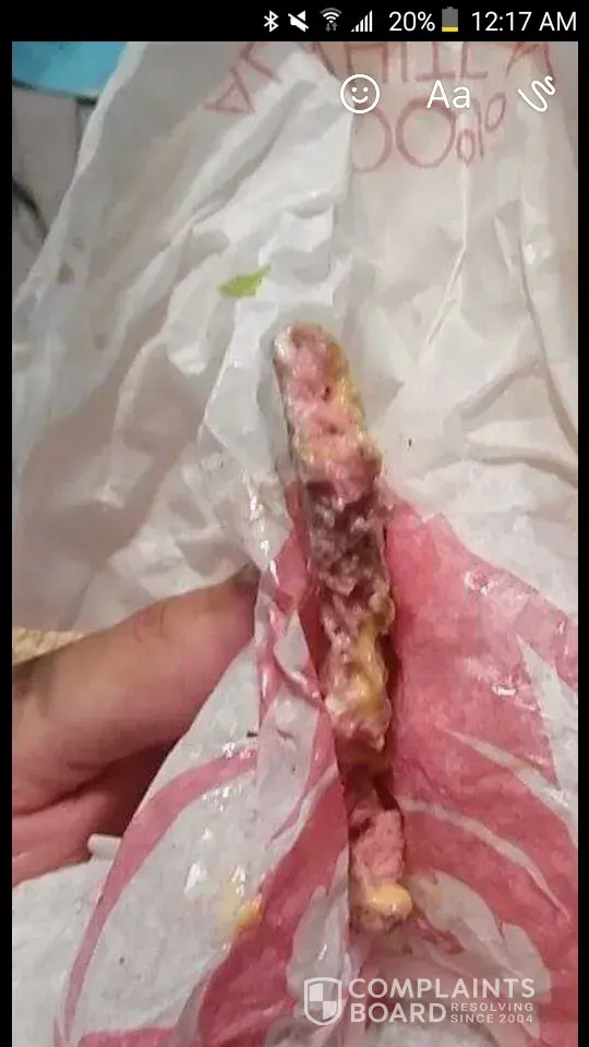 On may 23 2017, I went to my nearest wendys store to get a couple of burgers. Store number is [protected] at 11:30 pm. When I got home and checked my burgers red sauce was dripping. I took a bite and the whole patty was pretty decently red. Noticed the bag even had a blood stain. They seemed as if they were rushing cause of their line, and I kept over hearing what sounded like the cook needed something. I looks like this rushed made my burger uncooked. Im sure we k ow yhe safety measures we have to take with meat products. Please co tact back at my email