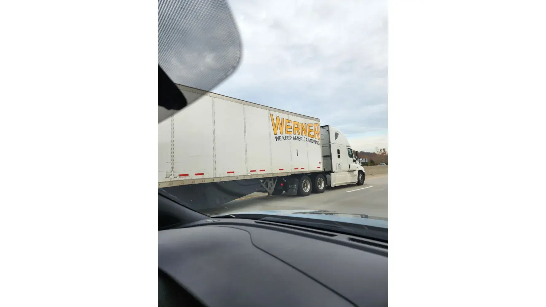 For at least 10 minutes an 18 wheeler in the left lane is driving a constant speed just far enough back where the bright headlights are shining in my side mirror. This truck finally passes me at 6:24 pm and I see it is a Werner truck.