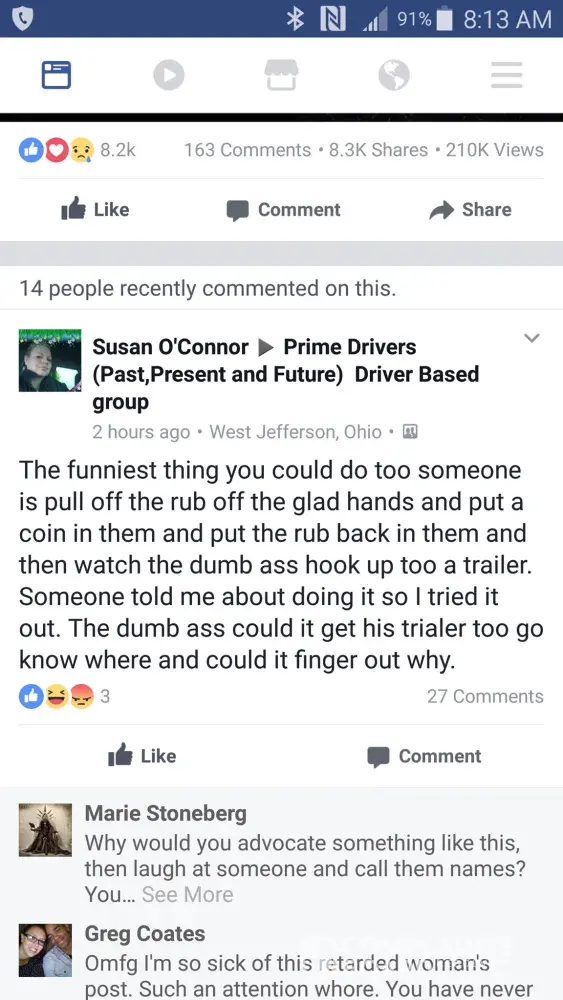 One of your drivers thought it would be funny to endanger another drivers life by messing with their air brake glad hands. There is a screen shot of her post on Prime drivers Past, Present, and Future. Please get this person off the road, because as a driver, had she done this to me, I would be filing criminal charges against her and the company she works for, which according to her Facebook page, is you.
