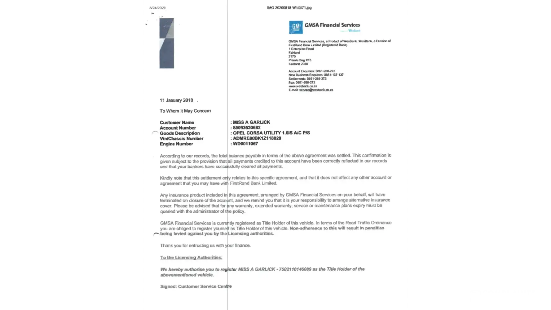 Secondly, Proof of Insurance was provided to them before the vehicle was even released from the dealership, so what proof of Insurance do they need now? I then indulged them in their games and called my insurance to get an updated confirmation letter, which i emailed to Wesbank.
