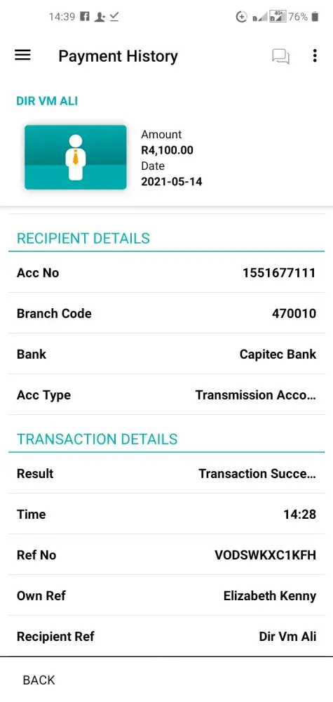 -In 1 month(March), I paid R17500.00 to recover the arrear amount, Meaning Wes bank had enough time to update the account. Instead they continued sitting back, watching the client paying more money every month knowing that the vehicle will be taken away from the customer by using unprocedural means.