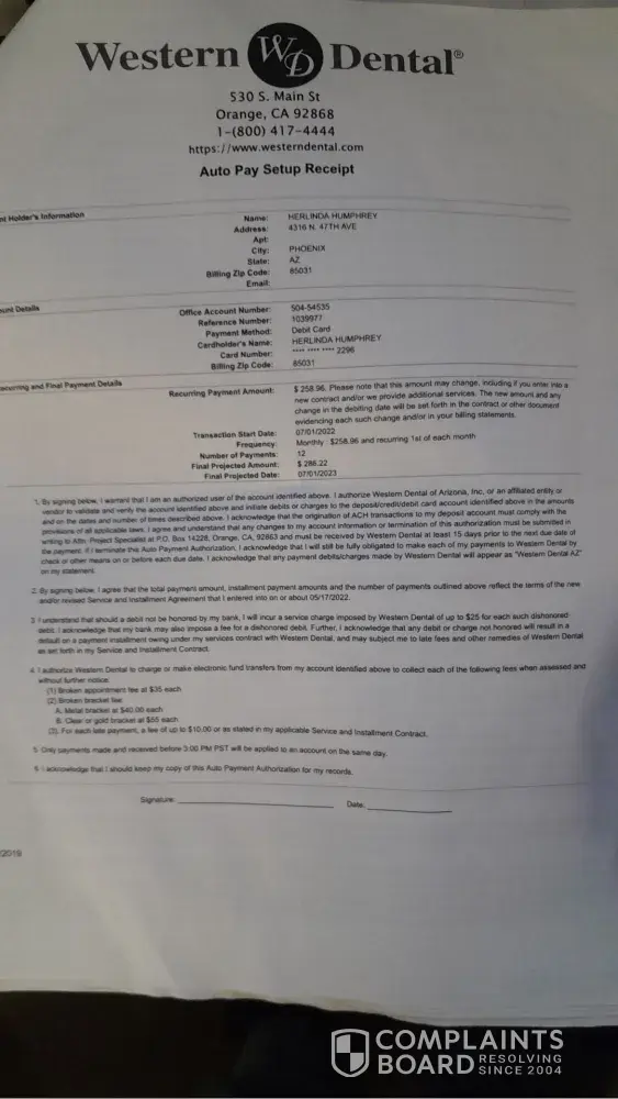 On 08/19/2022 I went to western dental orthodontist where I had a 2 pm appointment. Everyone was friendly and very nice and helpful. Around 3:30 pm the so called orthodontist began my dental work I was having braces put on the whole time during the procedure she talked and laughed with the other orthodontist I had to keep asking if they could do the suction because I was unable to swallow due to my mouth being wide open. It took her a minimum of maybe 20 minutes to get done she did not take her time at all. So when I made it home I was so excited about showing off my gold and pink braces that I never looked in the mirror at them. Oh not to mention I paid $4512.24 for these braces included all my appointments and work for a duration of a year. I was very disappointed when I finally looked in the mirror because I had gotten a whole in my upper lip when I saw haw she had placed these braces on my teeth I was out done. So I went to this dentist on wheels just to see if I could get some wax and I asked her opinion she immediately told me that they were not placed in the correct location of my teeth. Bottom line I have not been able to enjoy my braces because I am constantly having this wax on not one or two braces but the top and bottom of almost every brace in my mouth.
