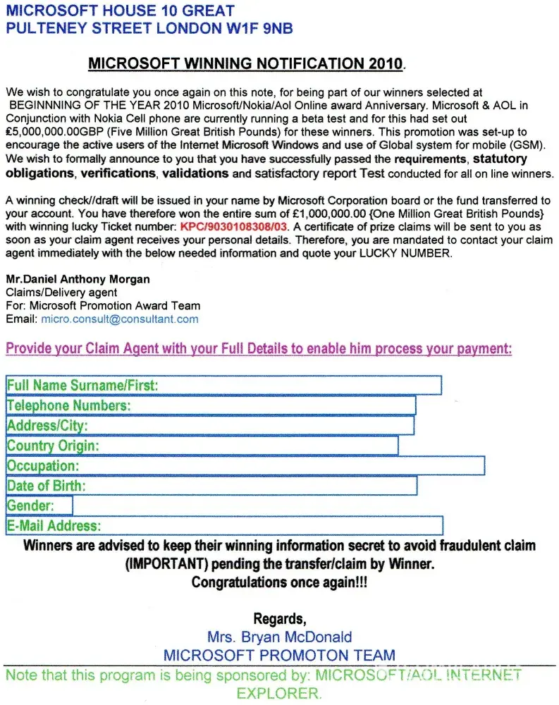 I am Mr. Anthony Carmelo of the Western Union Head Office Department here in Lagos Nigeria. Yes, you have an outstanding payment with Western Union here in Lagos Nigeria and it is ready for you to pick up at any Western Union Branch anywhere in the world. I would like to remind you again that this payment is coming to you as a compensation from the Nigerian Government to you because you have been enlisted as one of those who have been defrauded directly or indirectly by Nigerian Citizens. You are to receive a total of 4, 000.000.00 Pounds Sterling.