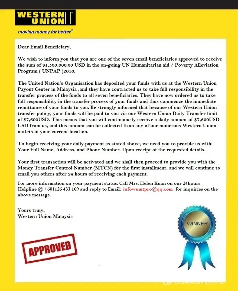 I recieved this email the other day coincidence: Subject: (western union payment) contact lee yung via [protected]@aim.com for payment Date: thu, 3 mar 2011 10:02:29 +0000 From: [protected]@recordeuropa.com Western union money transfer Malaysian pay-out center Attention beneficiary, We wish to inform you that the united nations (un) has taken over the...