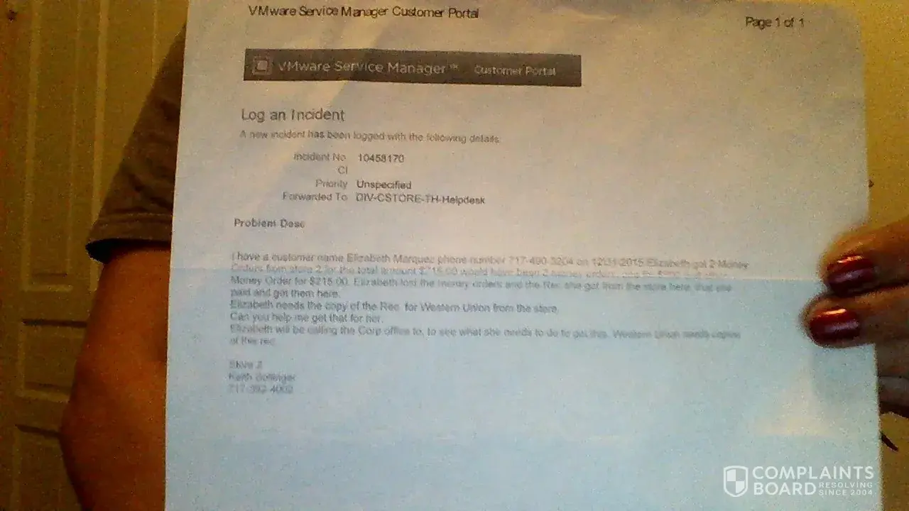 my name is Elizabeth Marquez I lost my money order and proof of purchase it will be a year 12/31/2016, I have send them everything I have in my possession, I have been complying with western union. but not enough proof also the money orders in question have not been cashed.
