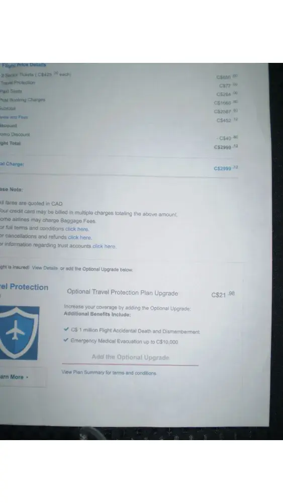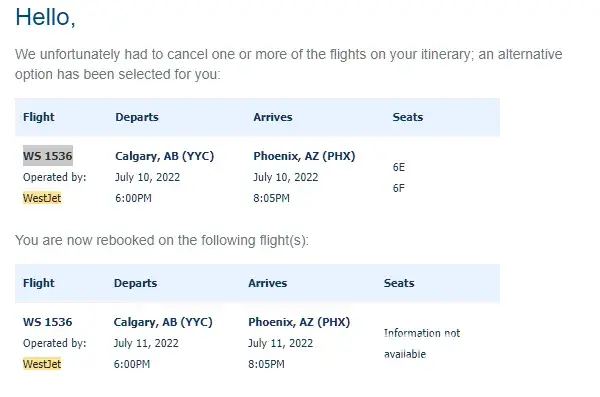 2. Westjet itinerary revisions were made mere hours before departure.