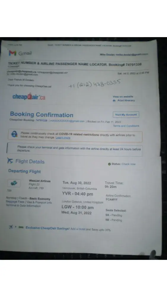 Traveling from Vancouver international airport on Friday 5th August on flight number WS712 changing at Toronto for flight number WS34 to Dublin, Ireland; (the boarding gate for this flight From Toronto was changed twice on the day of departure. Gate 23 & Gate 41), then on to Leeds/Bradford airport on Ryanair flight number FR 156 on 6th August 2022.