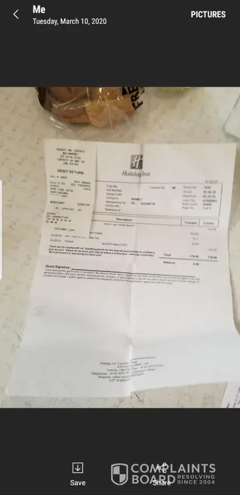 Unfortunately my prearranged ride from Moncton to my home could no longer accommodate me so I had to book a hotel for the night. The hotel room cost me $149.79 plus the cab ride from the airport was another $50.