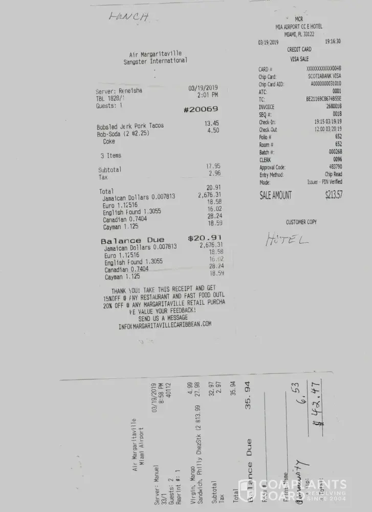 Tuesday 19th - Miami Hotel $213.57 USD