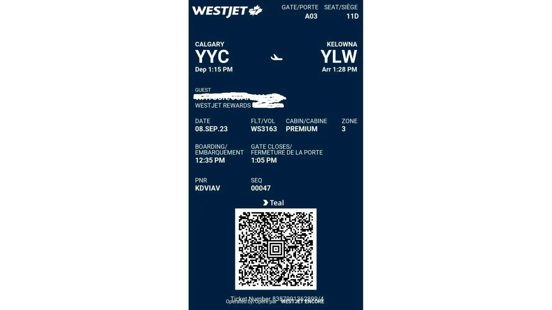 on Flight WS 3310 Sept. 13, 2023 9:10pm to 9:50 pm from Vancouver to Kelowna .