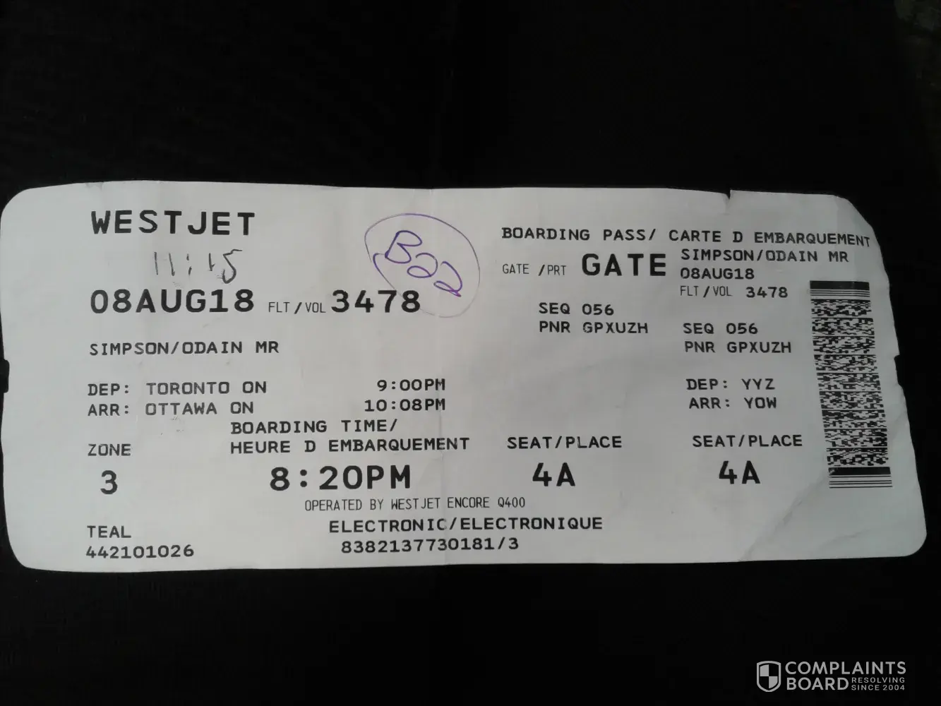 Our flight number was WS4 traveling from London Gatwick Apt to Toronto Lester B Pearson airport on August 6, 2018.