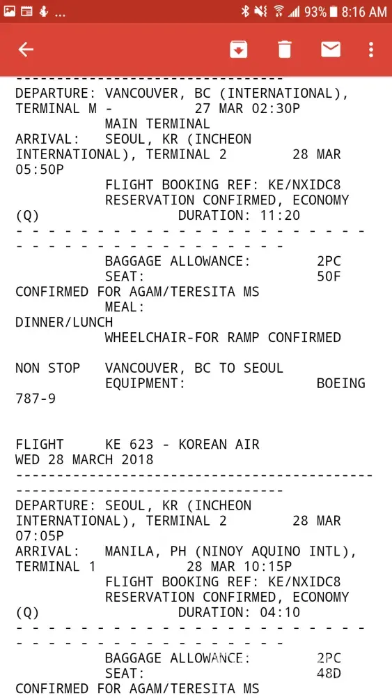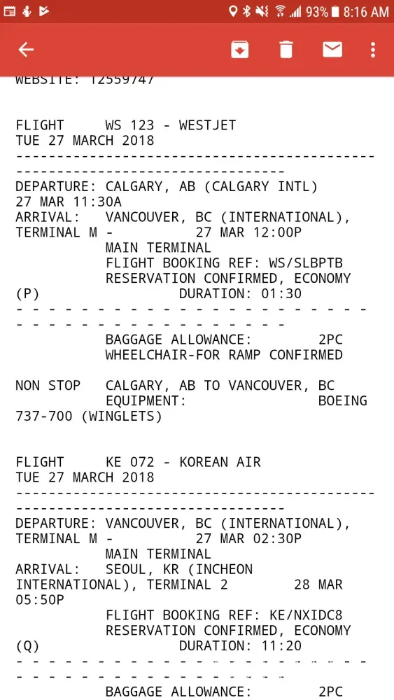 My mom went home to Philippines on mar 27, 2018 flight WS 123 departing van, and connecting to flight KE 072 I C airport, flight KE 623 to NAIA airport, they track the luggages it was left in vancouver... We live in ilocos sur province about 8hrs away from manila... she get the luggages on saturday but she arrive on wed at 10:15pm "INCONVENIENT"..