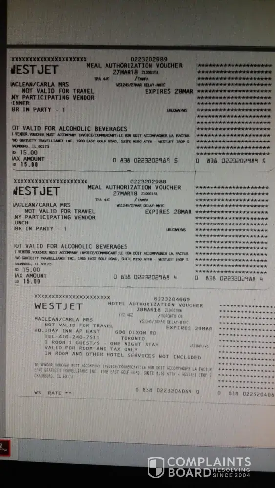 The next day I received an email from WestJet apologizing for the flight delays and a $250.00 WestJet dollars into my account that needs to be used within a year….what a joke! I was provided with some meal vouchers that I still have and of course the hotel voucher provided was useless as there was no time to make use of that. This is a goodwill gesture, not compensation which I feel I am entitled to.