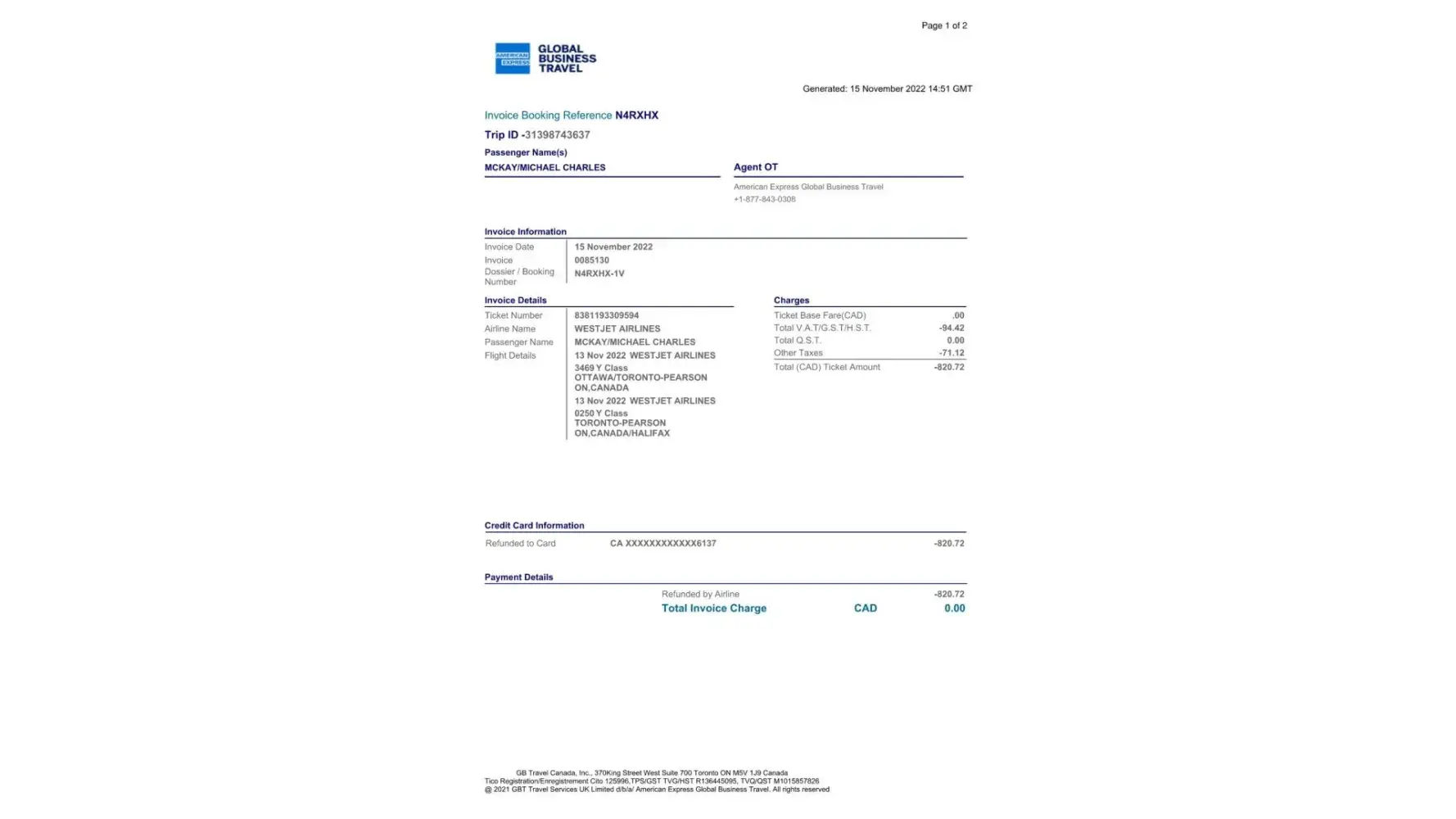 On November 13, 2022 I was scheduled to fly to Halifax (Booking Code BUAGOL). The schedule was changed such that it would have taken 36 hours to travel to Halifax with an overnight stay in Toronto. As this was a business trip and coordination with other members of my team was required, this schedule change was unacceptable and required me to book with another carrier. My travel agent was contacted to make the change and a credit note was issued which has not been reimbursed to my credit card.