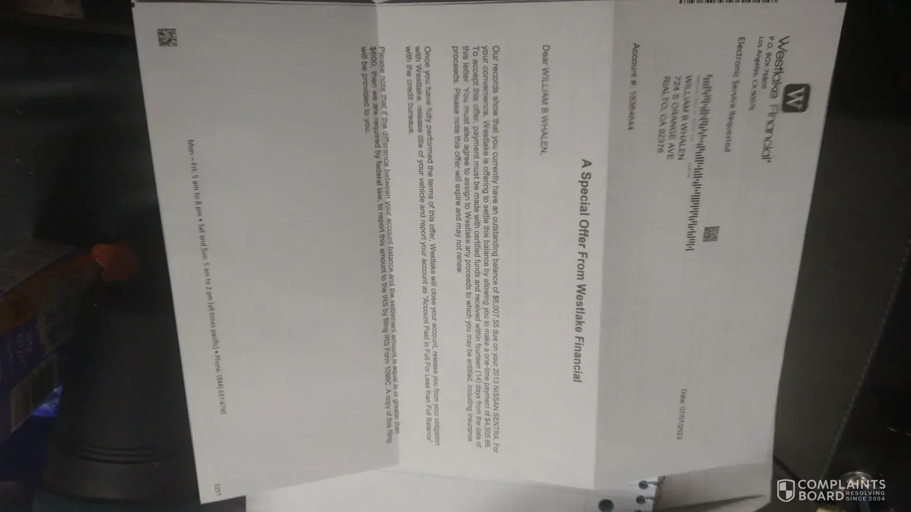 I paid the company each month without problems until, MARCH 2022, at this time I was notified I would now have to pay, "WESTLAKE FINANCIAL SERVICES, a debt collector, which none of us would have a choice in this matter.