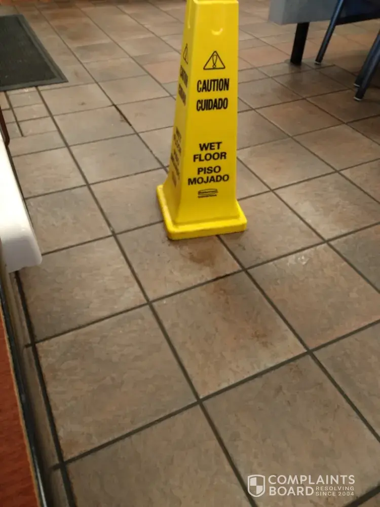On 3/15/08 I spent almost an hour here while my grandson had his fries.This a weekly stop for him to relax and play with his I pad, there was a wet floor cone there to whole time, some customers almost tripped over it getting to the salt/pepper etc. The pickles sliding down the window has been there for a week. This place has really gone down down hill in the past few months.