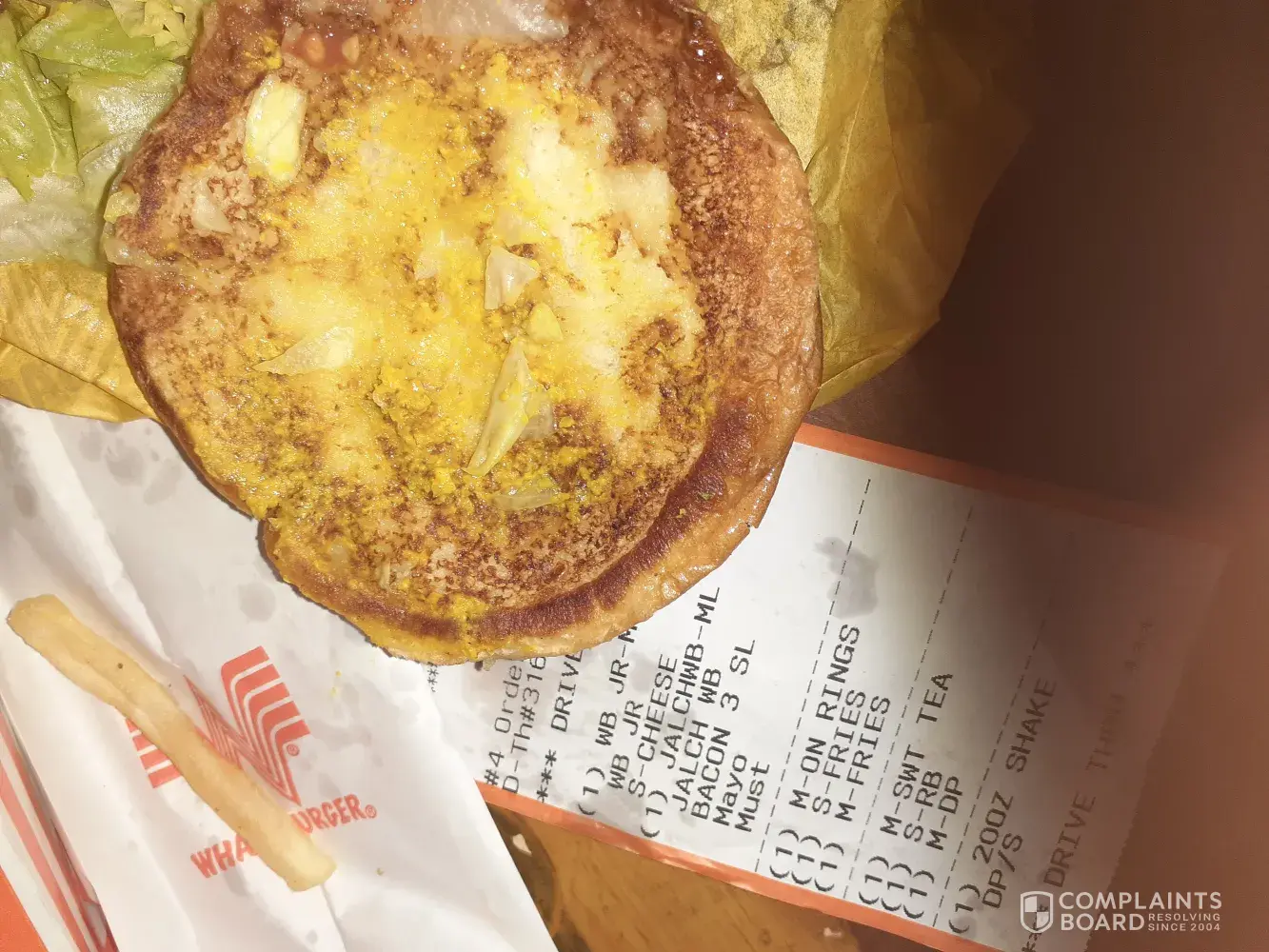#5 Bacon & Cheese WB ML, No Tomato, Grilled Onion, Extra Mustard, LG Onion Rings & MD Sweet Tea Cashier David B 10:32:12 PM Burger was wrong. Talked to manger Mark 11:35 pm. He knew my burger was for a counter order. Manager refused to offer any solution. He said I could wait 2 hrs to go back bc vents & building