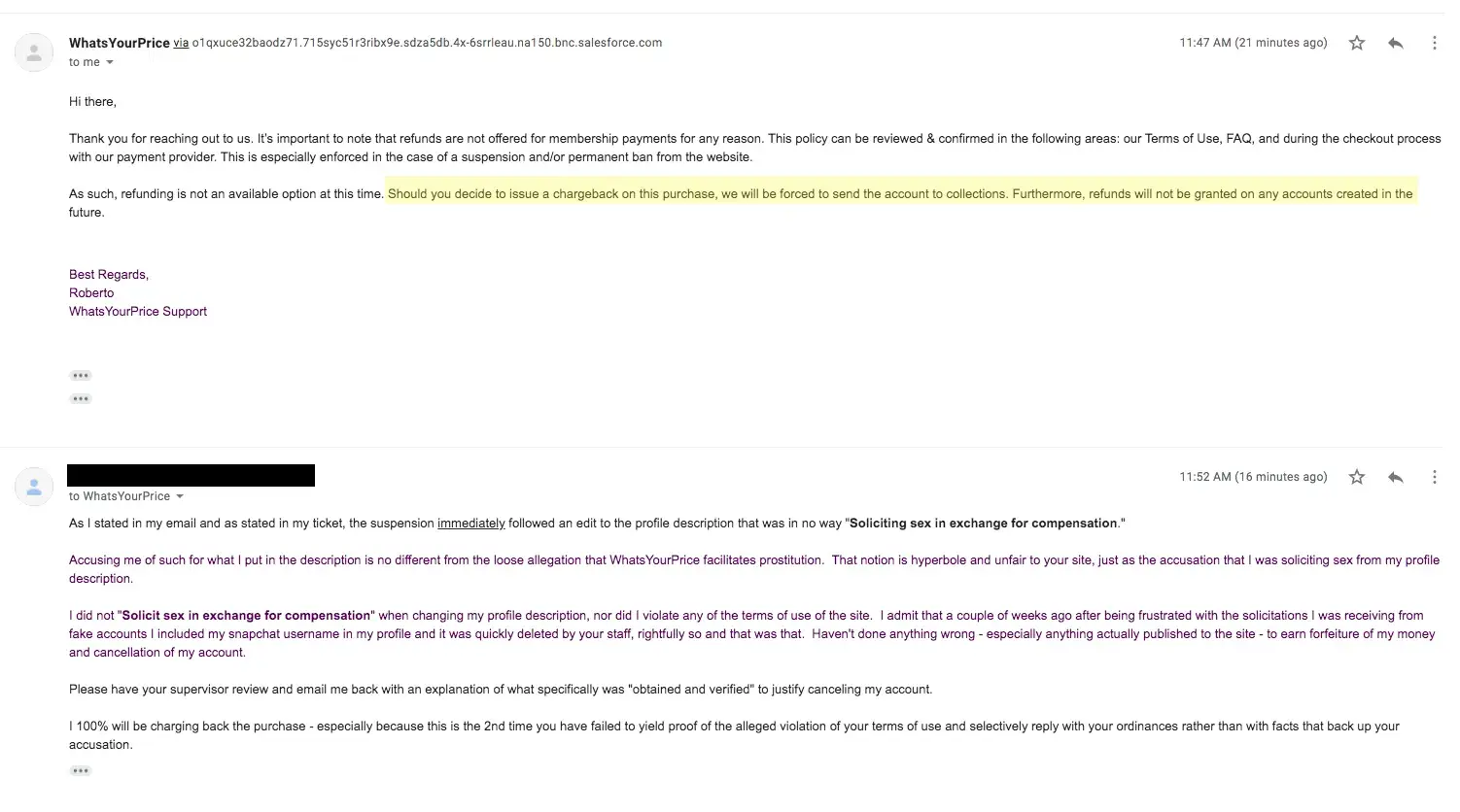 It's frustrating that they would rather protect a disrespectful escort than a paying customer. It's also illegal to make people pay for a service they can't use, so I encourage anyone who has had a similar experience to file a dispute with their credit company. It's important to let them know that WhatsYourPrice is protecting escorts on their platform.