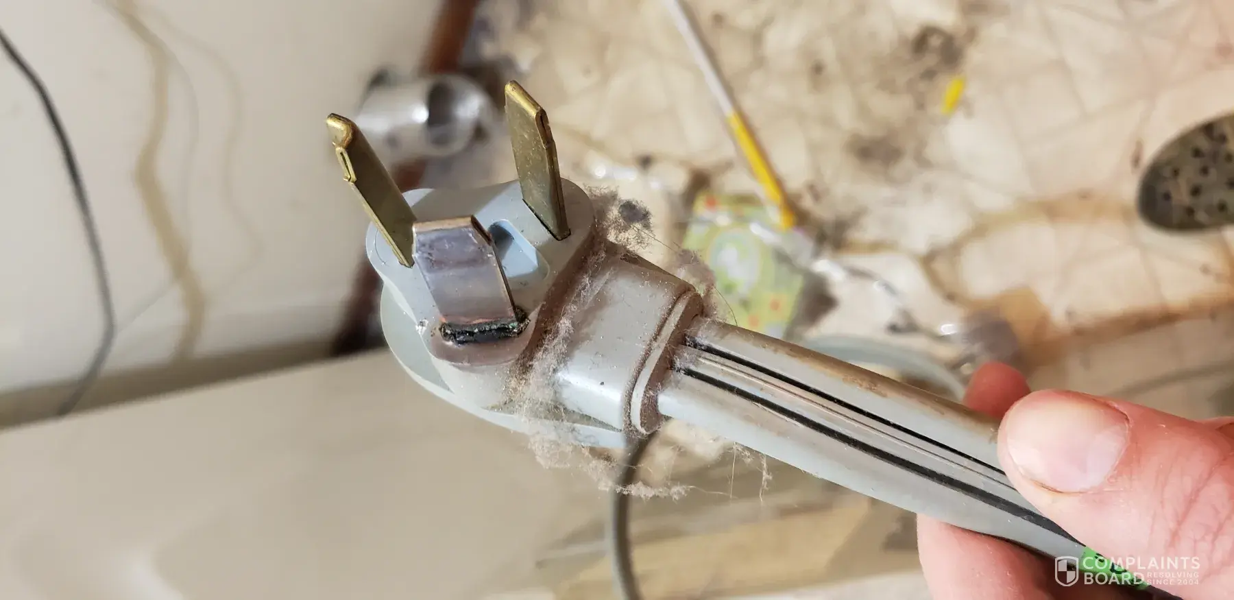 While cleaning I pulled my Whirlpool Dryer away from the wall and disconnected its 220v power cord. I immediately observed some corrosion and resistive heat damage to one of the prongs on the cord. I appears to started melting the hard plastic on the plug itself. The unit is a front loading dryer model no LE7680XSW1 with serial number M90870677. I am not sure on the date of manufacture, it is an older model. The date the damage was discovered on the plug was 6/10/21.