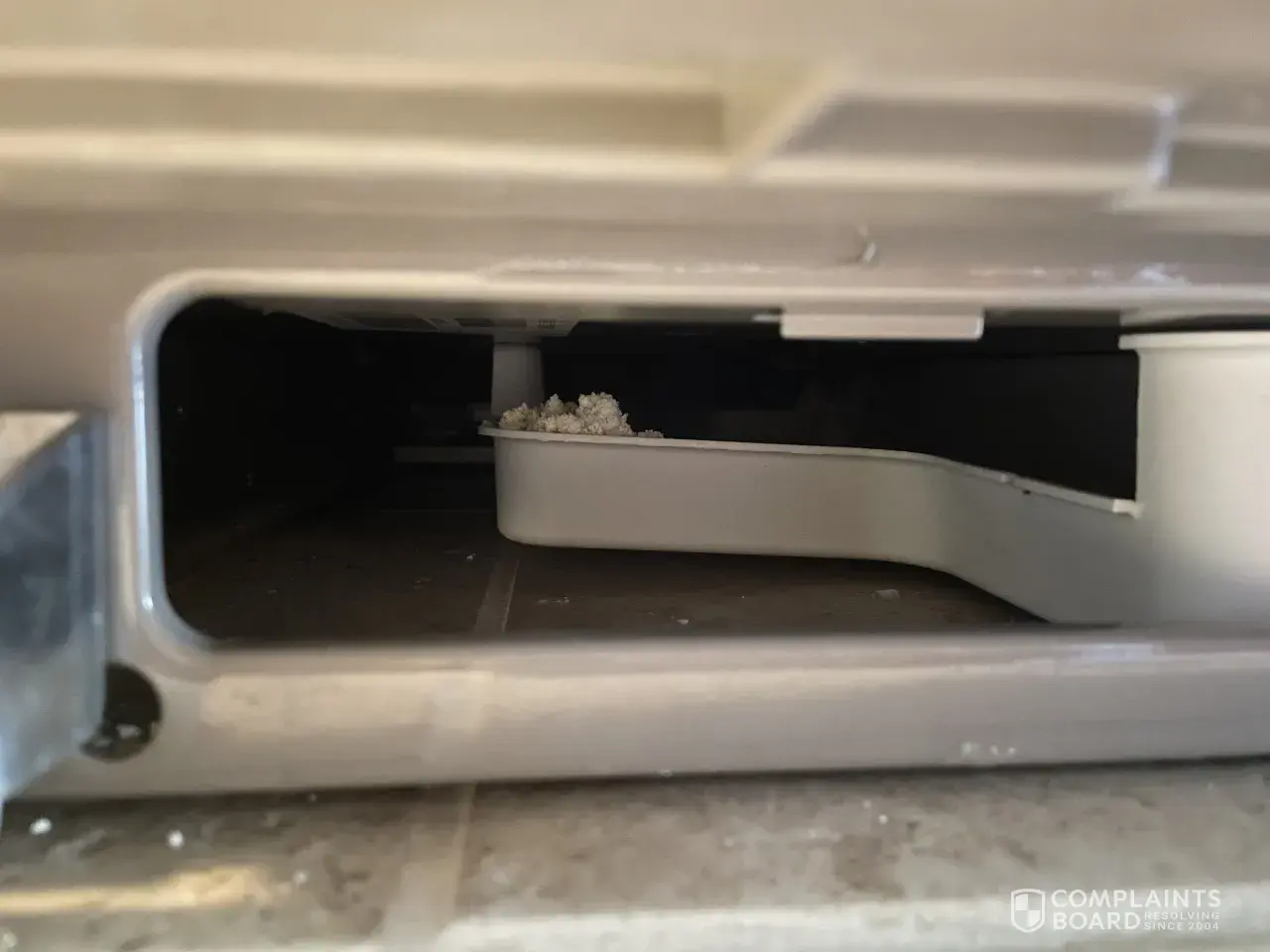 We purchased our Kitchenaid refrigerator model #KRFF707ESS01, serial #F82977910 in October of 2018. In May of 2022 I noticed a off whote powdery substance under the botton freezer in the drip pan. I was finding this substance on my floor and was searching for the origin of it. I had Raliegh Appliance Repair out to see what it was and where it was coming from. He could not figure out what it was, he contacted Kitchenaid and they had no idea what it was. I called Kitchenaid in 2022 trying to resolve this and they had no clue what is could be, I asked if I could send a sample to their labs to make sure it wasn't harmful, I was told they don't have a lab. I emailed Kitchenaid in June of 2022 trying to get a recommendation of a lab to have the substance tested, with no rsponse. I just had Platinum Service out a Kitchenaid repair service, they also had never seen anything like this before and could not figure out what it was. We have a small dog and 6 grandchildren, my hope is that the substance is not harmful, our dog has developed pancreatitis in 2020, dogs will eat anything they find on the floor. I do my best to clean up the particles when I see them. There is no way to get to the drip pan to completely clean out the substance as it accumulates.