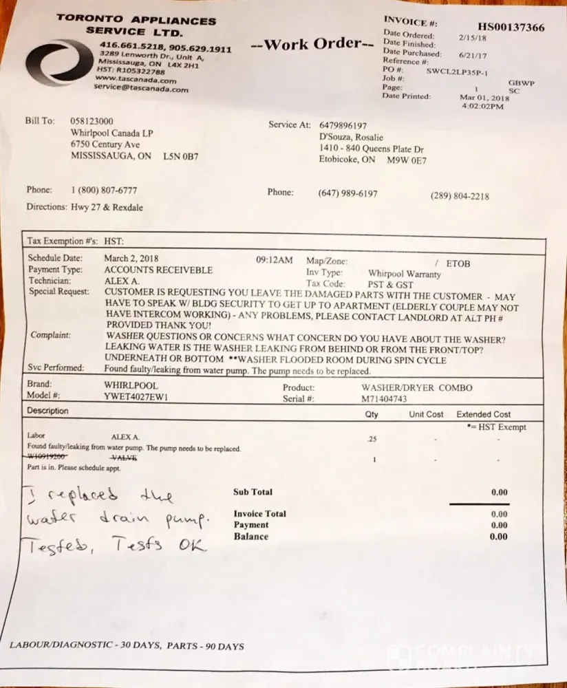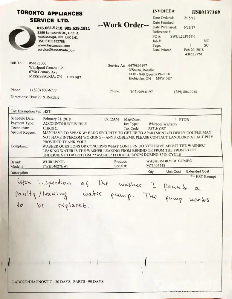 My client# 6794. I washer dryer in my condo which was under warranty and the faulty water pump spilled water all over my floor damaging 500 sq feet of bubbling of the floor. They fixed washer dryer but i have $3500 of property damage which i have not received any resonse.