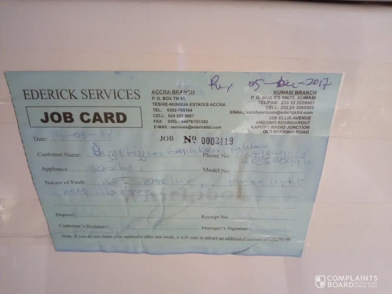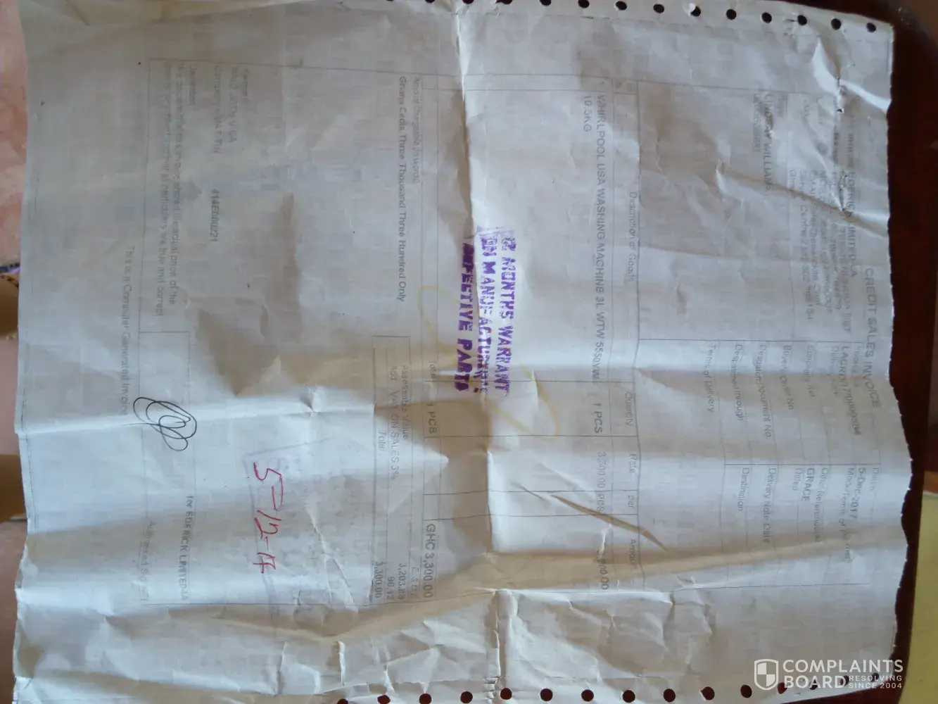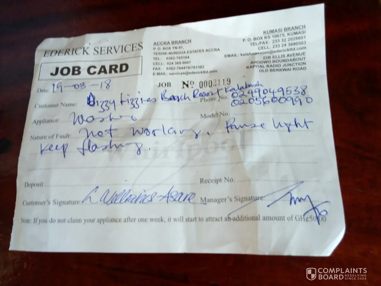 We are a small hotel/restaurant in Accra Ghana. We purchased the whirlpool washing machine in Dec. from Edricks in Accra. Since we have had it there has been an electrical intermittent fault. We called the engineers out in February which took 5 days to come and charged us GHC100, as the problem was getting worse and worse. They said it was the way we were using it. We tried to manage it but the fault continued so we took it into their workshop in March. They tested it for a short time and said it was working. When we brought it home it still didn't work properly . We called them again for the engineers to come back out and find the fault, we are still waiting! When we call them they say their schedule is not worked out yet, we have been waiting 7 days for an engineer. I have had whirlpool products for over 30 years and know they are reliable, but I know this machine is faulty. The electronic programme buttons are not working and the door is not locking. Now I do not know what to do as its a brand new machine which has never worked properly.