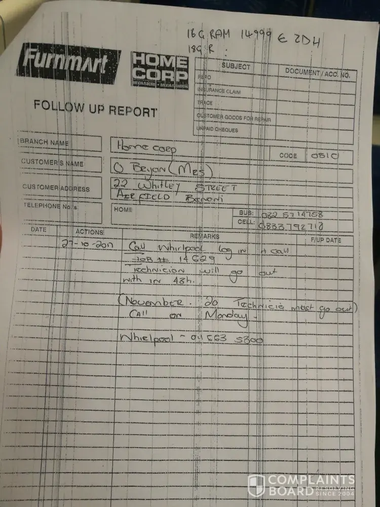 Good day. A technician contacted me on 30/10/2017, saying he can see me now. I was at work and not available. I have no maid or person at home during normal working hours. My husband was on leave 20 /11/2017. Appointment was for 13:00 technician now show. Whirlpool supervisor assist with phone call to technician, which I could also do (his nr [protected]) . I have call log nr # 14629, fault with my oven clock This has been a problem for more than a year now, would like to have it fixed. Please confirm a way forward as I am only at home again during office hours on the 18+ 19 December 2017. And due to resent avents I can not book a reliable technician for then.
