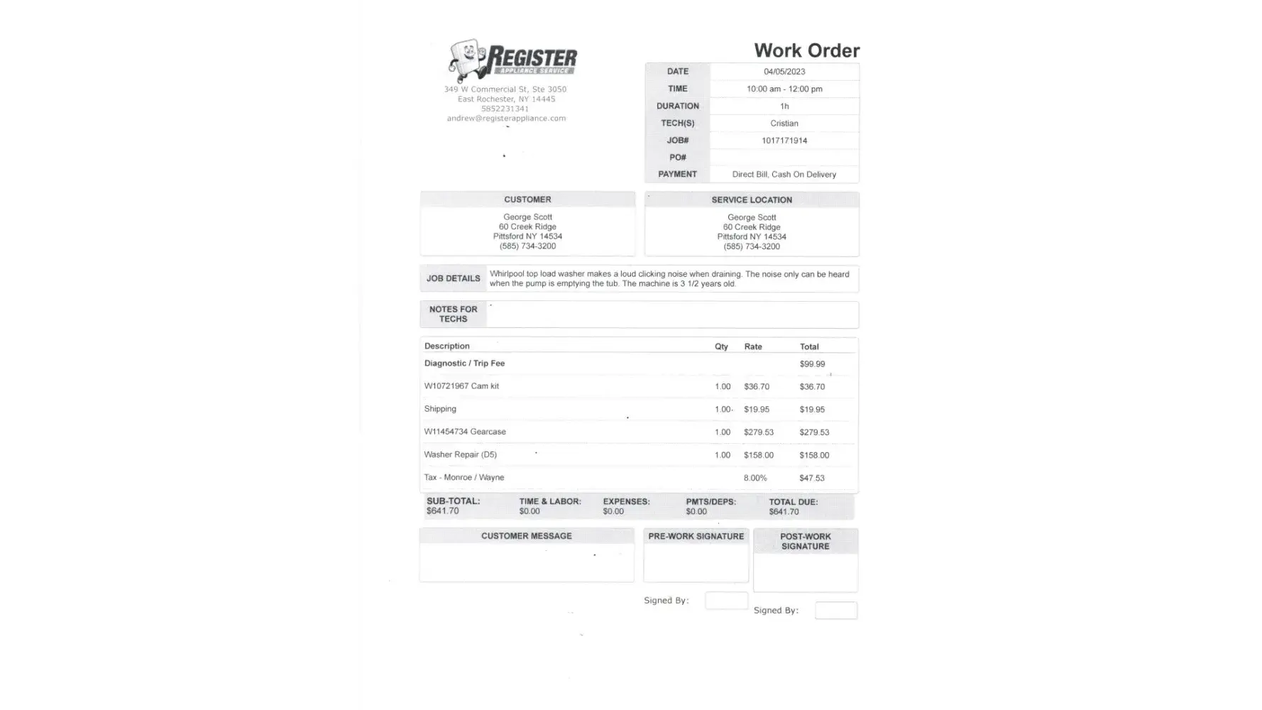 We called for service from Register Appliance Service, 349 W. Commercial Street, East Rochester NY 14445, because it was making a continual clicking sound when draining, and getting worse.