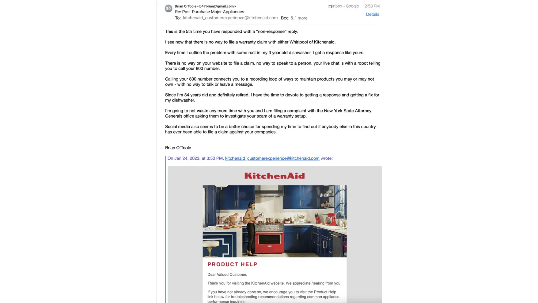 It's impossible to file a warranty claim with either Whirlpool ( the parent company) or Kitchenaid as there is no way to file a claim.