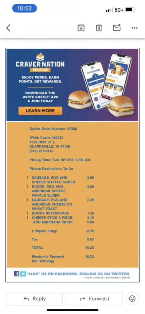 Stoped at my local White Castle the other day for breakfast. Made my order in drive in. Got to window for my order and got ready to pay. While reaching in my money clip I ripped my ten dollar bill in half. The young man at the window refused to take the ripped bill. Told me to get another bill or credit card. I didn’t have any credit card with me and only had a hundred dollar bill besides my ten. He refused to give me my order or take the ten. I told him I had both halves of ten and all he had to do was tape them together. Re still refused my order. I had to just give up and drive off. Not only did he waste the food, but I didn’t get my breakfast. The very next restaurant I stopped took my ten dollar bill in both halves and gave me my breakfast no problem. What a big deal he made of a ripped bill and waste the food at same time