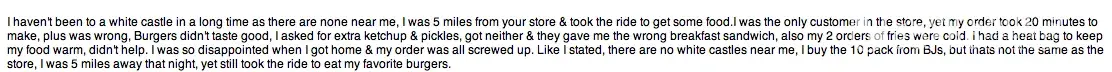 I haven't been to a white castle in a long time as there are none near me, I was 5 miles from your store & took the ride to get some food.I was the only customer in the store, yet my order took 20 minutes to make, plus was wrong, Burgers didn't taste good, I asked for extra ketchup & pickles, got neither & they gave me the wrong breakfast sandwich, also my 2 orders of fries were cold. I had a heat bag to keep my food warm, didn't help. I was so disappointed when I got home & my order was all screwed up. Like I stated, there are no white castles near me, I buy the 10 pack from BJs, but thats not the same as the store, I was 5 miles away that night, yet still took the ride to eat my favorite burgers