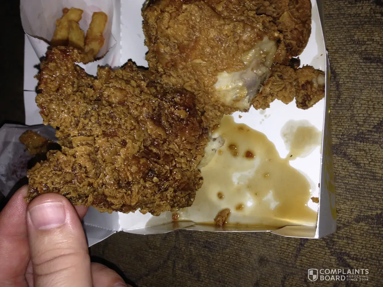 10/16/2022 03:51pm check :20031 the chicken was old and dry the texas 2 peace meal with french fries large everything was good but the chicken seamed left was dry and old