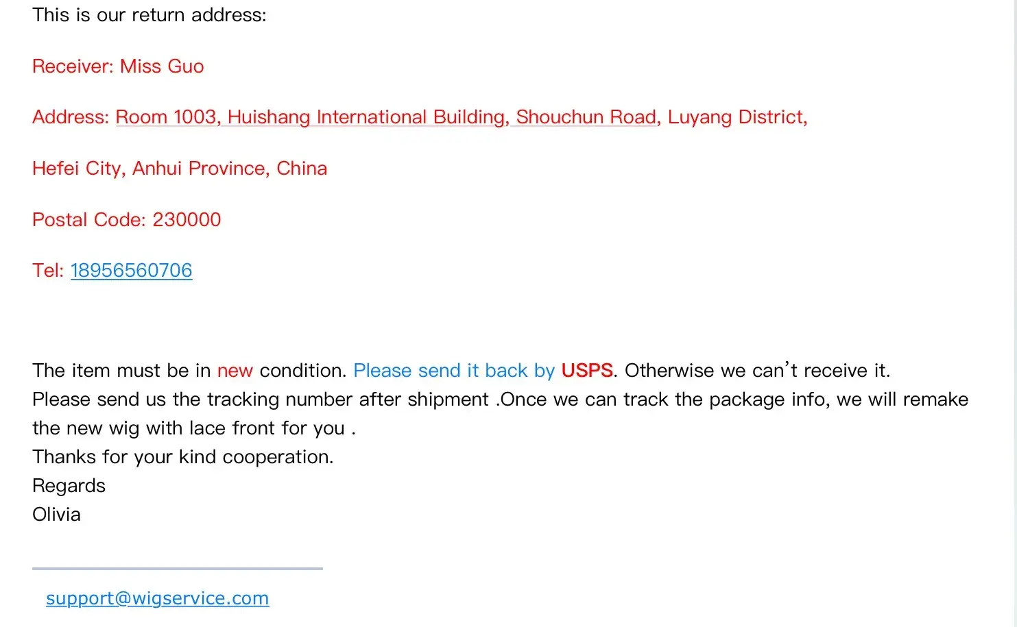 WigSis confirmed return address via PayPal and FedEx as of 07/15/16 in China is Zhao Qiang, Room 1003 Huishang International Bldg, Shouchun Road, Luyang District, Hefei, China, 230061, [protected].