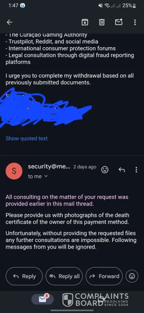 I told them that I couldn’t legally provide it. Melbet said they would ignore all future emails unless I submit it. This is unethical, abusive, and a violation of consumer rights.