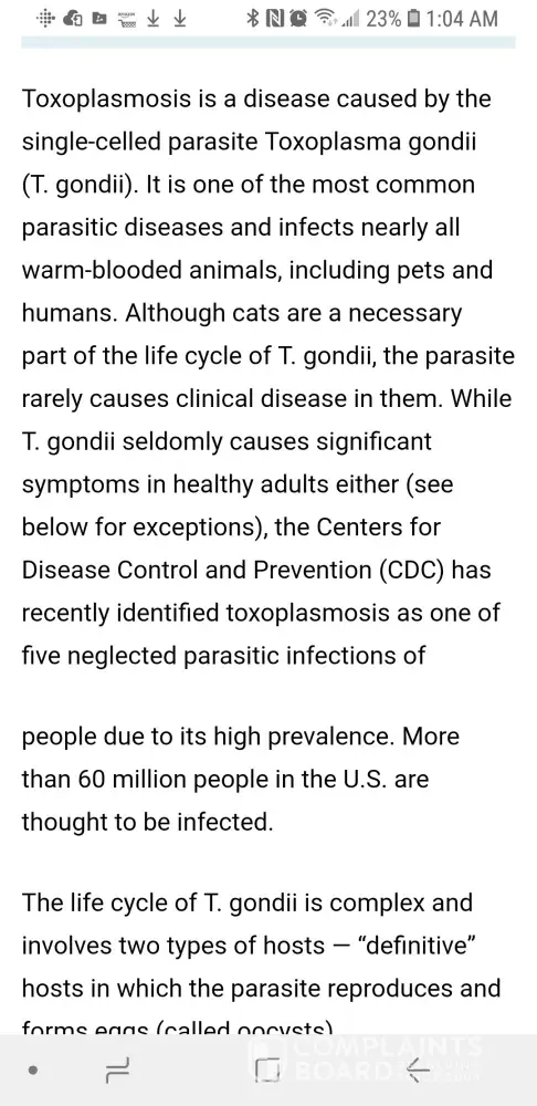 I went ahead and looked up toxoplasmosis. On the Cornell University website that shows that that is caused by cats eating infected animals or by eating raw meat. I do not feed Raw. So if the cat has that it's from eating a mouse or from the owner eating raw food.