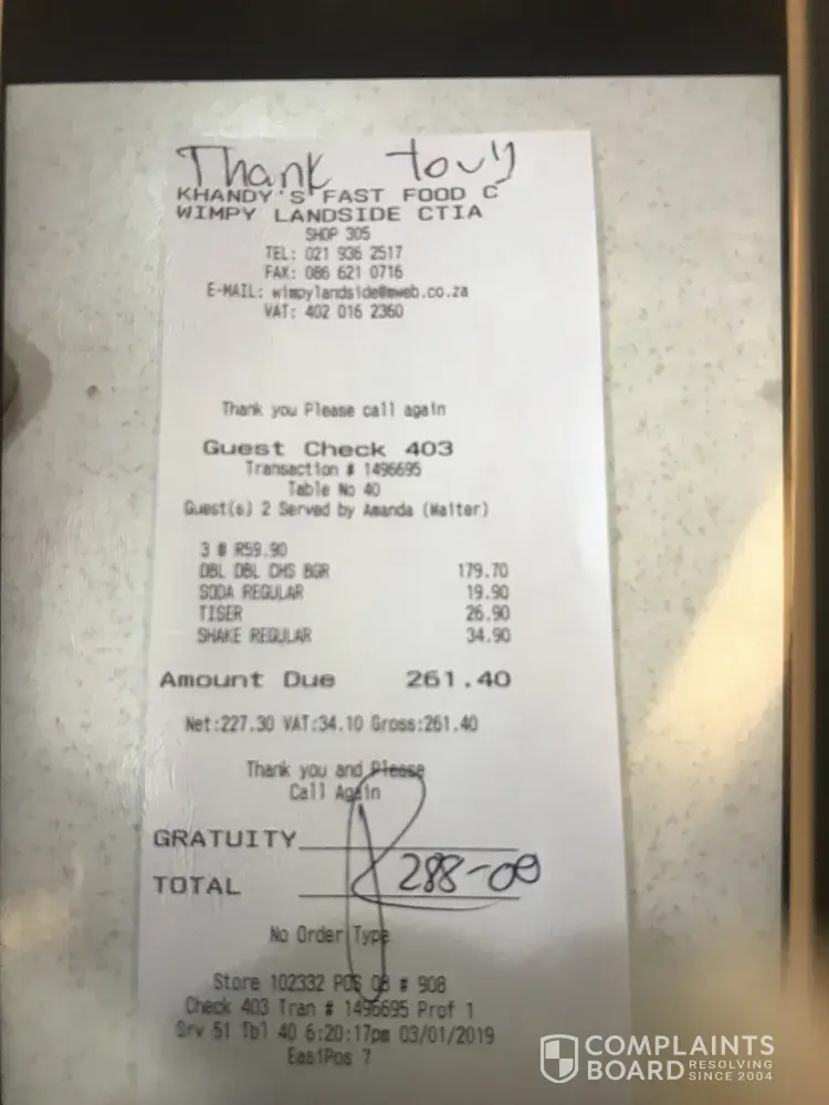Our Bill had no sweets. It was highly unpleasant especially after the service we received. We were extremely hungry having skipped breakfast and we decided to eat and we would've let it go if the corrected my partners food properly with a fresh sauce and if the manager showed genuine concern. We are extremely unhappy and want to log and official complaint. my number is Zizile Sibisi my number is [protected] my email is [protected]@gmail.com