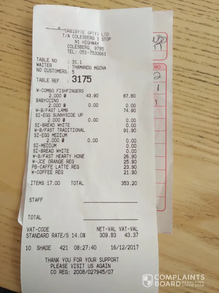 Today we went to have breakfast at Wimpy Louis Trichardt. We waited for almost an hr to get a waitress and it was not even busy. We decided to call a pregnant waitress who came to asssit us, when Jeofrey came to ask if we fine we told him we were waiting for someone to assist us.