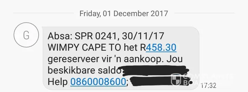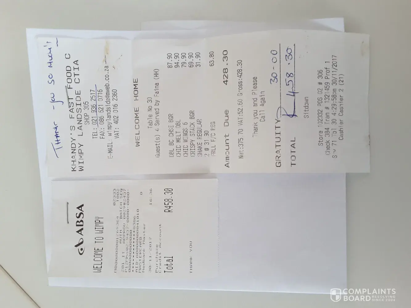 My family and I ate lunch at stated Wimpy on 30/11/2017, and struggled to pay. First 2 times the ABSA card was rejected but the third time the Nedbank card allowed payment. When arriving home we received an sms that indicated that the one ABSA payment had also gone through.