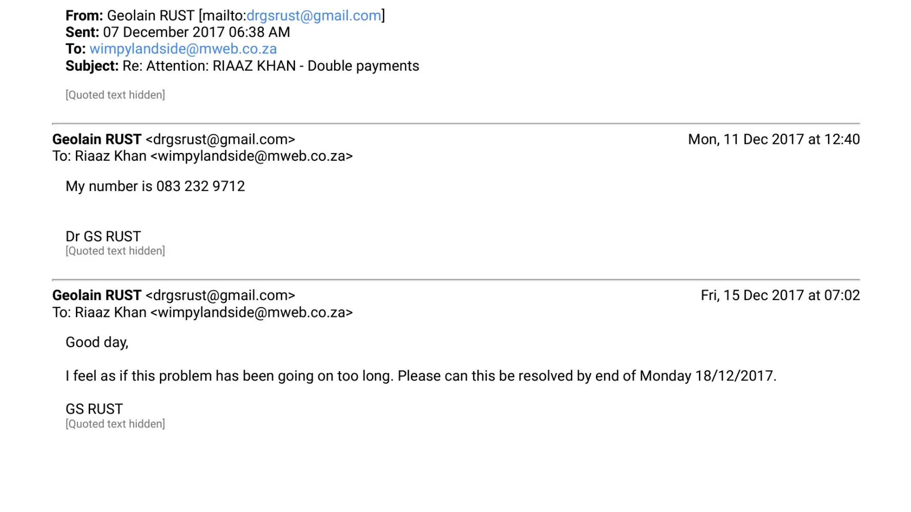 I am requesting that 1x R458.30 be paid back to me by end of day Wednesday 20/12/2017 as this problem seems impossible for Riaaz Khan to solve despite several attempts from my side to resolve it. Several emails and 2 phone calls later he has yet to do anything.