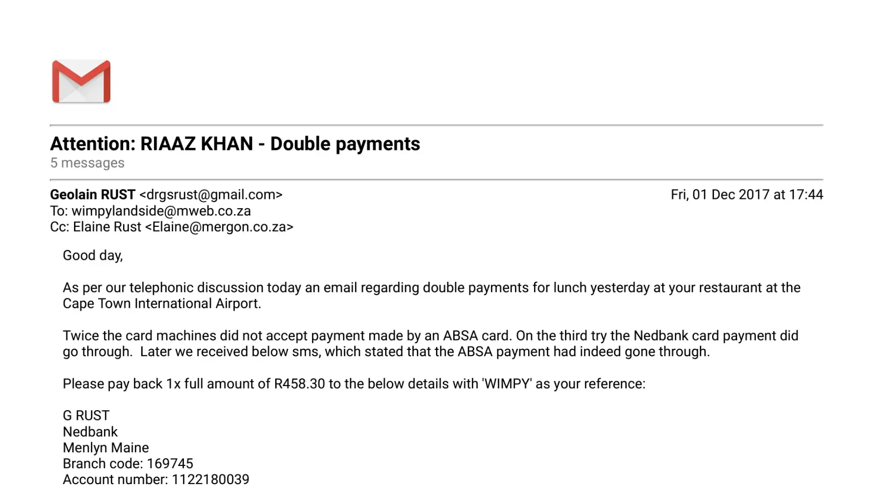 I have been struggling with your Cape Town International Airport Landside Wimpy for more than 3 weeks now regarding a double payment. My last email had stated that I wanted it resolved bt end of today, this was on Friday (2 days ago), and it is now going for 17h00.