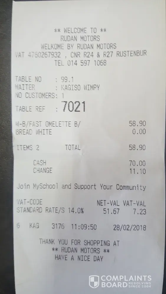 Today 28.02.2018 I bought a Grated chees, bacon and tomato omelette at Wimpy Rudan in Rustenburg.