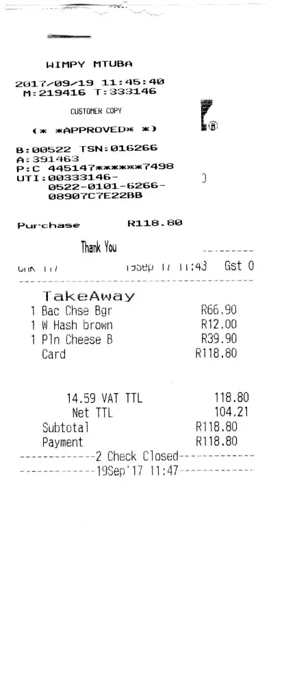 On 21/10/17 I visited wimpy rudan garage at 20:30 the cashier told me they no longer take sit down only take aways but the closing time displayed on the wall is 21:00. I asked her to call the manager to crearifie the matter then the lady said no we can sit. She attended us 10minutes later to take our order she placed our irder an came back with a bill say they are cashing up. The food was drie the chicken was very crispy. We received our food 20:50 then the waitress just left. The first incident was a cockroach in the drink now this. Dont u value your customers @ FAMOUS BRANDS.