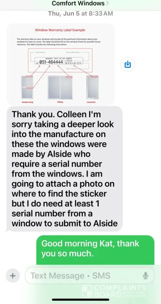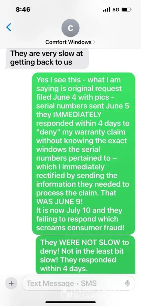 I purchased windows through Comfort Windows in Syracuse, NY, which were manufactured by Alside. Four of these windows developed defects that should be covered under the warranty. On June 4, I notified Comfort Windows of the issue. On June 5, I submitted photos of the defective windows. On June 9, I received a denial citing missing serial numbers. That...