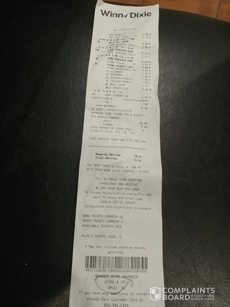Winn Dixie sold me two pieces of Lam shoulder chops on 10/6/17. Store number 0311 in Davie Florida. Manager's name was Winston who refused to gave up his last name. Winston refused to take meat back without receipt; even thought, he could pull it out from the computer by my reward card. So basically they denied their product. I was forced to go home to find a receipt, i did. My money were returned. I am just asking to let people know about this store. Watch what you are buying. This is despicable and unprofessional, treating your customer this way.