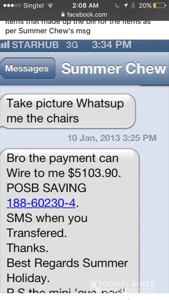 Anybody suspected he or she being asked to make payment for products purchased from the company, but to Summer Chew's personal bank account, please make a police report ASAP ! You are most like scammed by this smooth criminal !