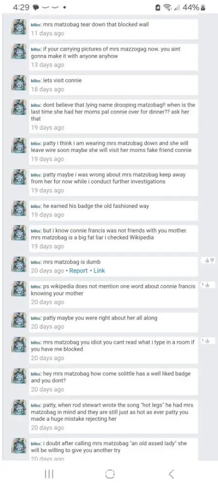I was repeatedly bullied, harassed and had 4 "mock chatrooms" made about me by Billcc aka Billcc950. This person is on wire from 10am to 6 pm day after day.