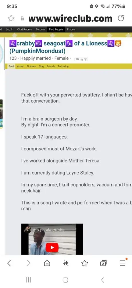 And let me tell ya, there's this one individual on there named Diana Mills who is just an absolute nightmare. She attacks people left and right with her hateful comments, and yet she's still allowed to roam free on the site. It's almost like Wireclub doesn't even care about fostering a positive and inclusive community.